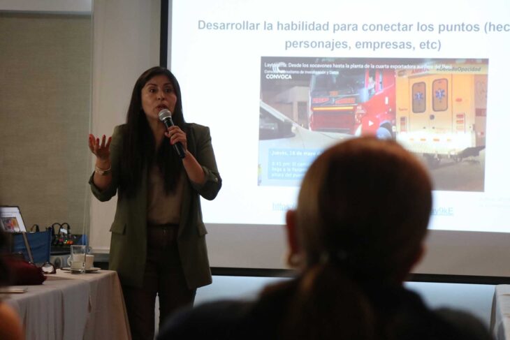 Milagros Salazar, directora de Convoca, portal periodístico peruano que publicó, junto con otros ocho medios regionales, la investigación transfronteriza Dorada Opacidad, con la que ganaron el Premio Internacional Rey de España de Periodismo 2025 en la categoría de Periodismo Narrativo, fue una de las talleristas invitadas a las “Jornadas por un periodismo seguro”.