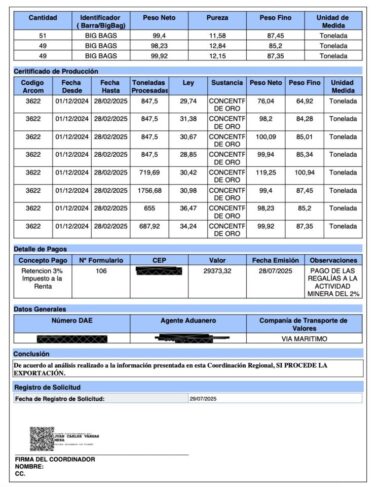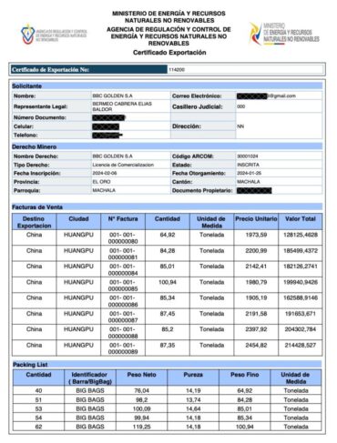 Un ejemplo que ilustra estas irregularidades es el Certificado de Exportación No. 114200, de fecha 28 de julio del 2025. En este documento, en el acápite del certificado de producción, consta el Código ARCOM 3622, que corresponde a la concesión minera Muyuyacu, que registra irregularidades vinculadas a empresas off shore en Panamá. Incluso la Corte Constitucional dictaminó que Muyuyacu volviera de las manos privadas al amparo de la Empresa Nacional Minera (Enami−EP), en febrero del 2025.